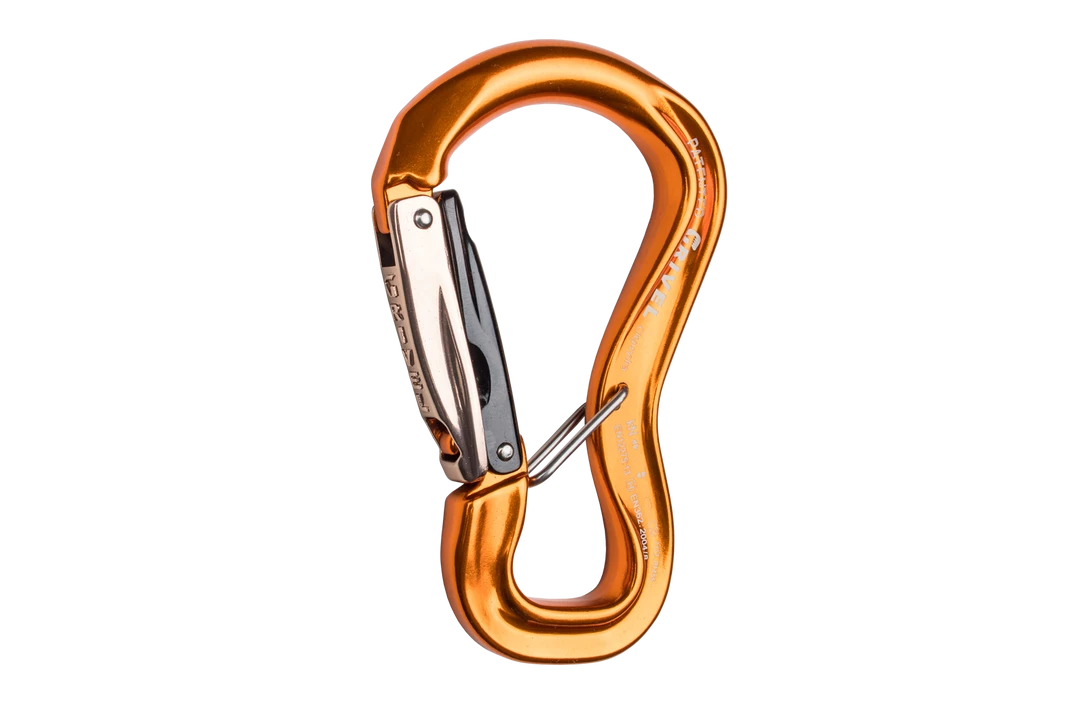 – flat in the lower part to follow the shape of the webbings of the belay loops, with “captive” safety wire to avoid “cross loading” or positioning along the minor axis of the carabiner, which would greatly reduce its strength