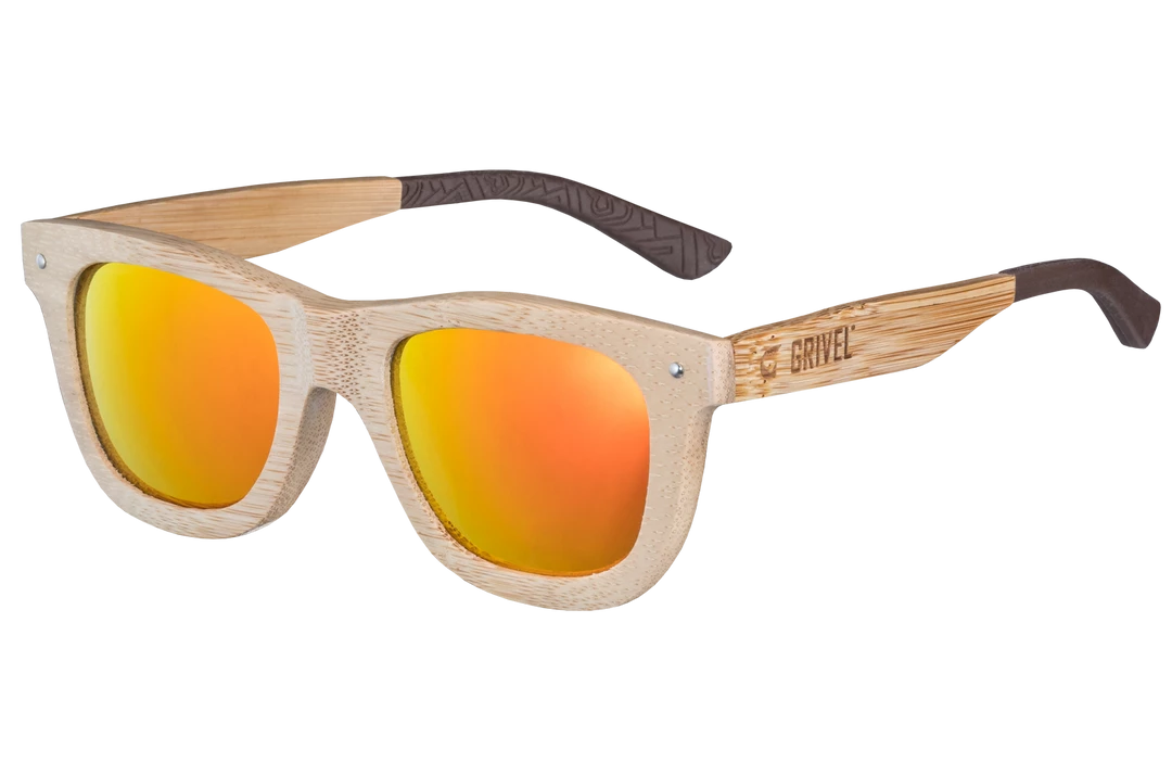 Sunglasses with bamboo frame and category 3 UV400 red mirrored lenses.