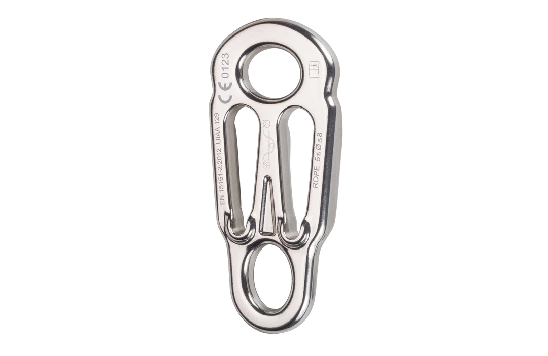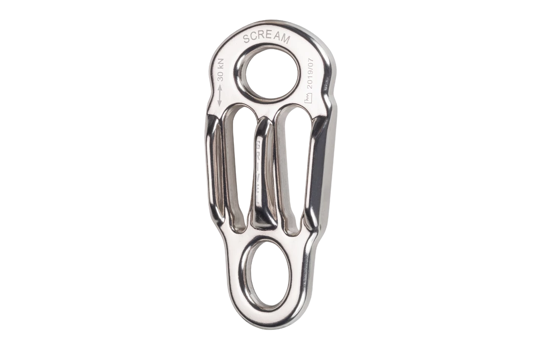 Scream is a belay plate made for rappelling with thin ropes. So far it is the only device rated for small-diameter ropes. It has two holes, the upper one for the belay and the lower one for connection during abseil.