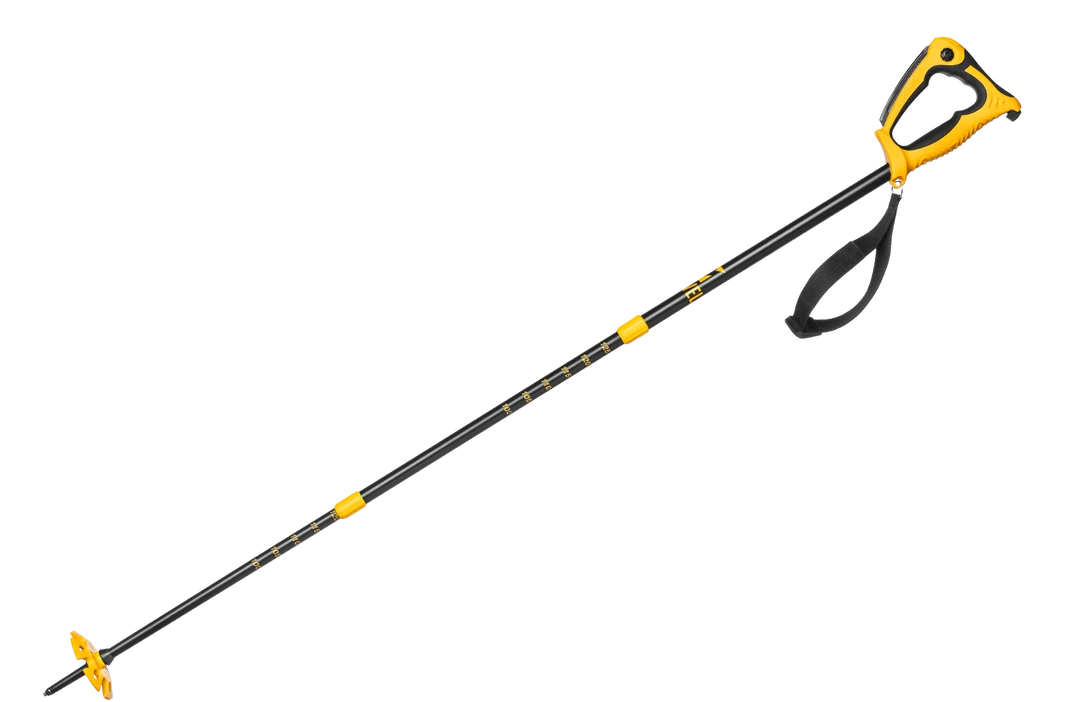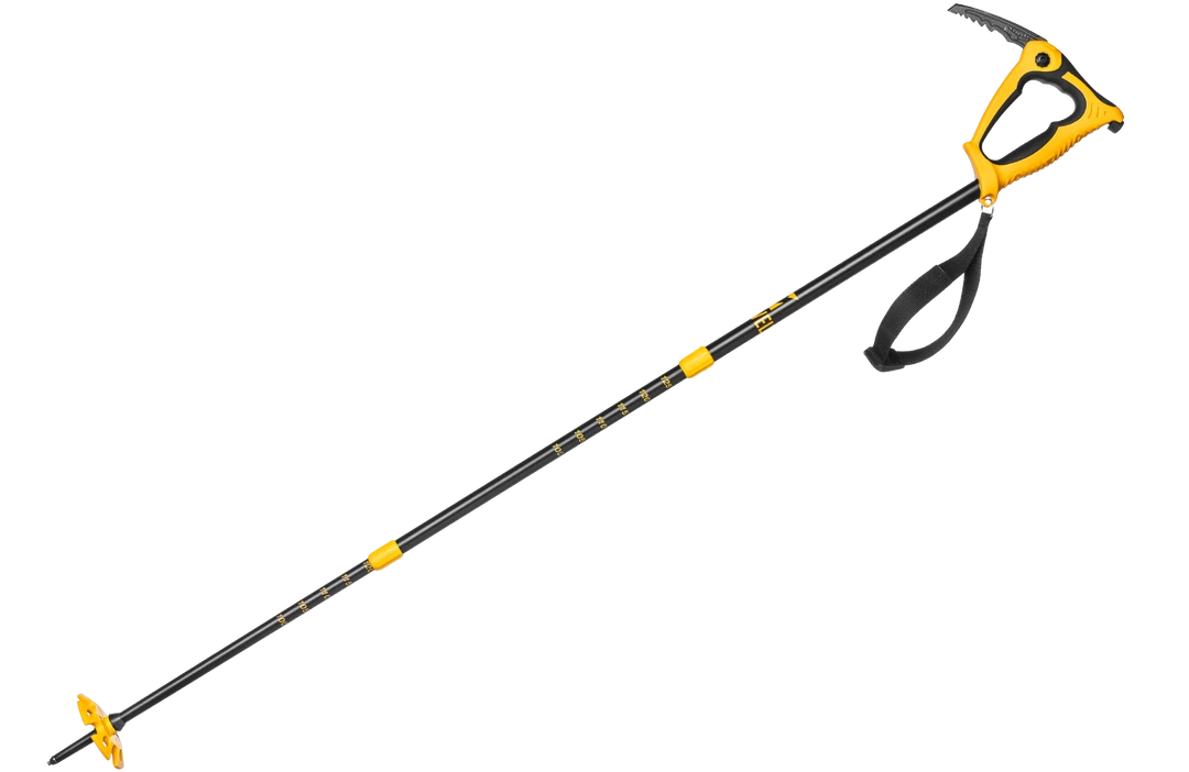 Condor 3 has been designed for ski mountaineers who face difficult, demanding terrain. It has an extractable hot-forged steel blade, which can also be used for a self-arrest maneuver. When the blade is closed, it functions as a normal handle. The handle is very solid, and the rubber part as well as being comfortable has an insulating insulation. Its shape allows hand protection both with open and closed blade. Composed of 3 sections, it is easily adjustable with an expansion system on an extended range. Very compact when it is all closed.