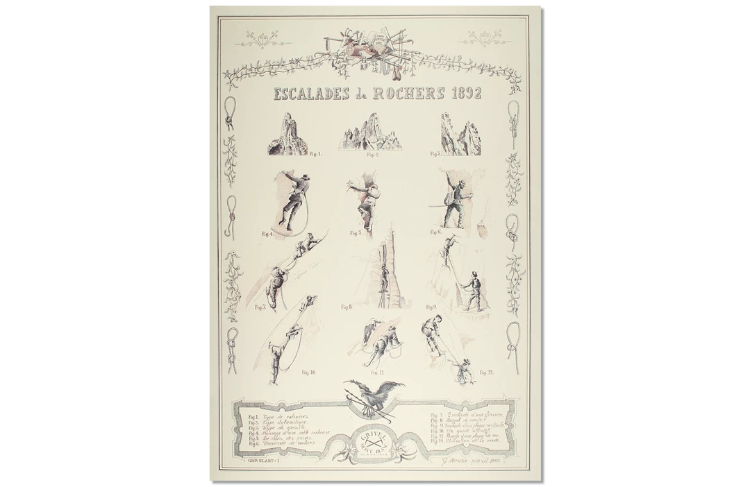 Lithographic print on recycled paper reproducing drawings of rock climbing technique from an 1892 manual.