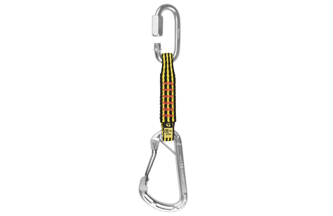 Indoor sport climbing quickdraw, with a quicklink and a Steel carabiner.