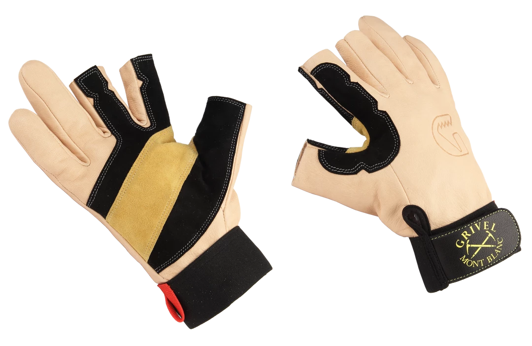 Versatile gloves for belaying, rappelling and via ferrata, made with tough goat leather and palm reinforcements. Two open finger tips (index and middle-finger) allow easier manipulation and precision.