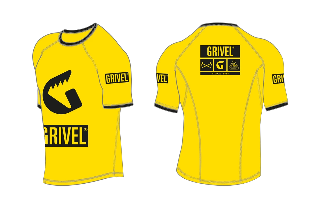 Yellow t-shirt in technical fabric, with Grivel logo on the front, back and short sleeves. Available in five sizes. Slim fit.